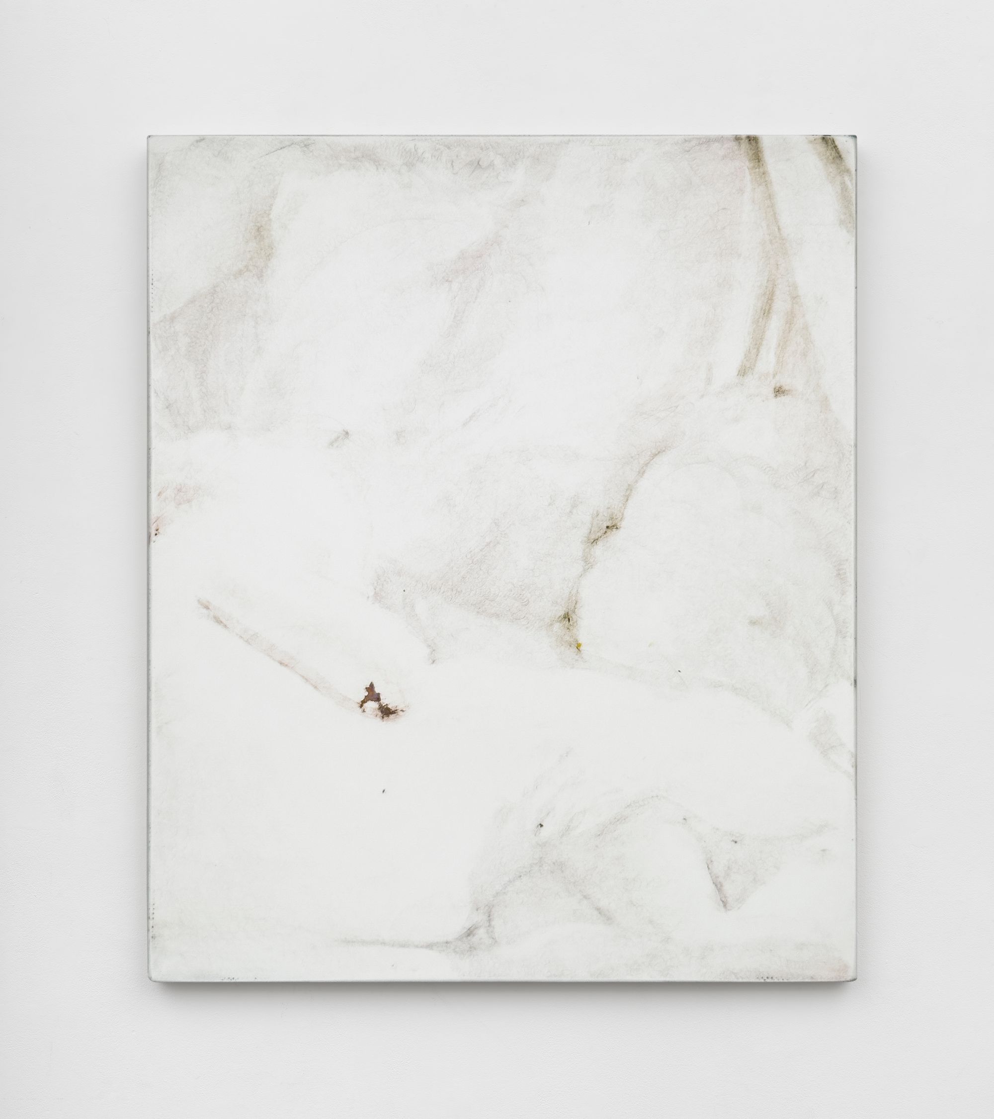 Hanos spent two years, more or less, preparing the paintings that compose this exhibition. Across dozens of canvases, Hanos’ signature eschewing of style was conducted with roaming, dexterous and experimental pictorialism. But once the paintings were ostensibly complete, in March 2026, Hanos suddenly, extempore, chose to efface them all, taking solvents to their surfaces and removing layers of material and pictorial matter, completing the paintings through near-total erasure.