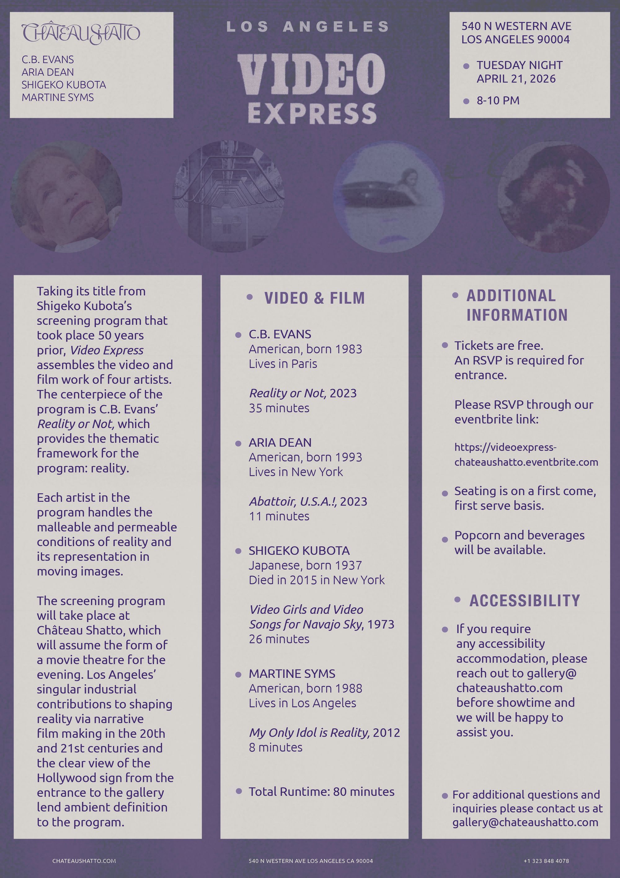 Taking its title from Shigeko Kubota’s screening program that took place 50 years prior, Video Express assembles the video and film work of C.B. Evans, Aria Dean, Shigeko Kubota, and Martine Syms.